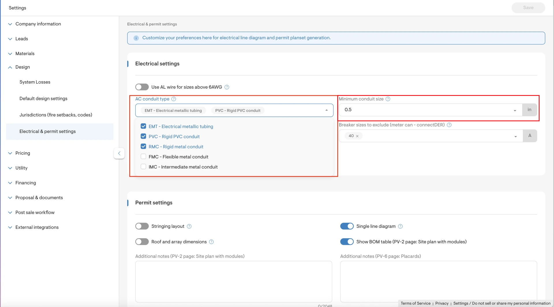 This setting allows users to specify the preferred conduit for the AC wire installation and the minimum conduit size for wire calculations. This is indicated in the wire details section of the electrical line diagram and wiring calculations page of the permit plan set. This ensures consistency with internal standards or local regulations.