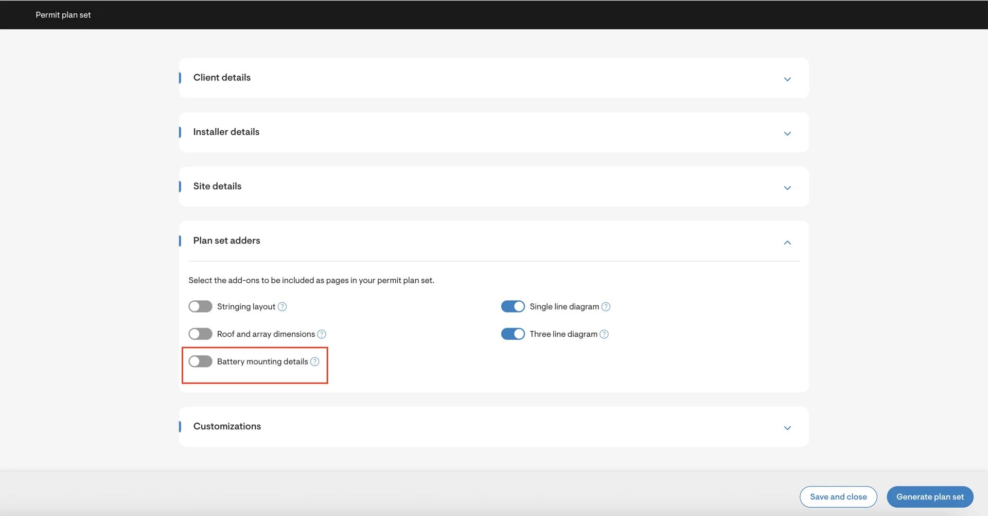 Battery jobs now automatically include battery mounting details as a separate PDF within the Equipment Specification section of the permit plan set.
