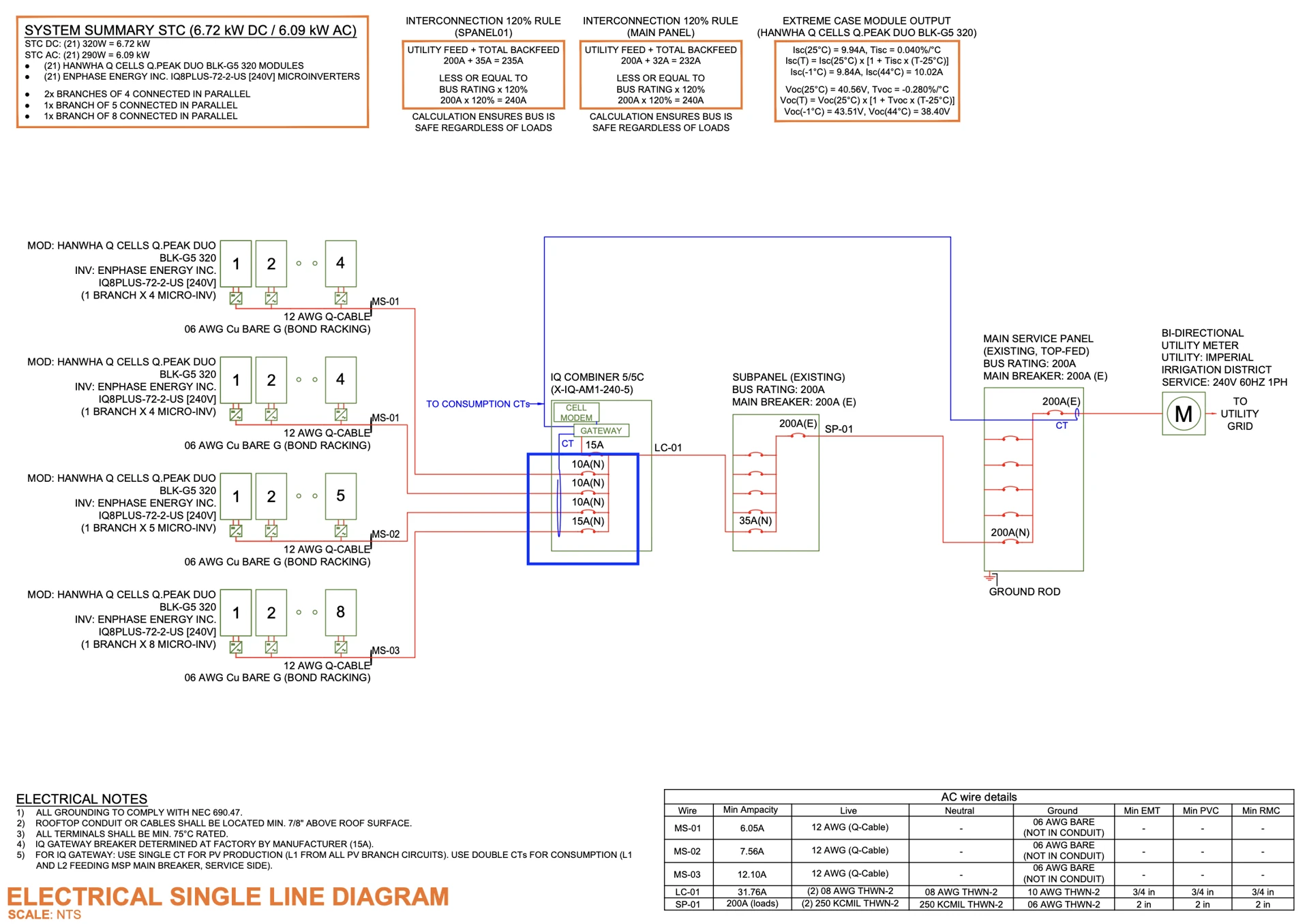- Single-line diagram: Shows the solar energy system's electrical components and their interconnections, including storage if applicable.