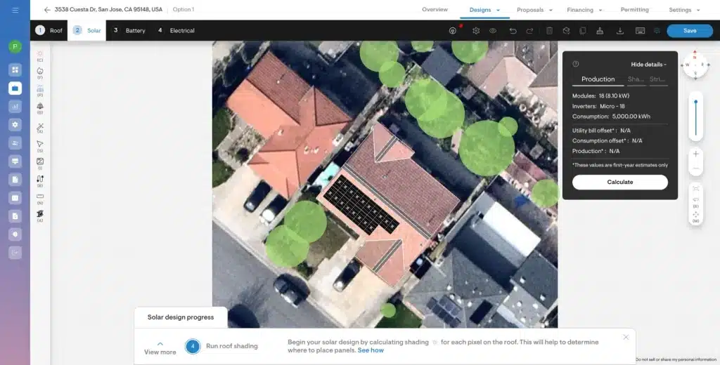 2. Place the panels on the roof based on the homeowner’s needs. If the designed system exceeds the NEC limit, Solargraf will notify you with a red indicator on the PCS tool.