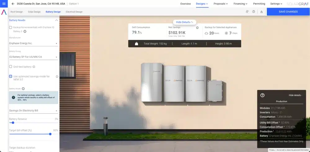 Solargraf design tool from Enphase helps our installer partners quickly and easily design solar and battery systems to operate under NEM 3.0 tariffs. The key to this tool is the software simulation and optimization engine—the same as the software engine that is part of the Enphase Energy System. Solargraf ensures that the proposal generated for the homeowner and its financial analysis matches the system’s actual operation. This optimized proposal is possible because Enphase builds the hardware and software, and there is intimate knowledge about the hardware and software system operation.