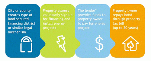 Available in over 35 states, PACE (Property Assessed Clean Energy) programs create locally funded government loans (through cities and counties) that pay the upfront costs associated with a PV solar installation. In exchange, the debt of the investment is paid by the property owner over the next 10 to 20 years on the property taxes, usually without a premium beyond the final costs of the solar energy system.