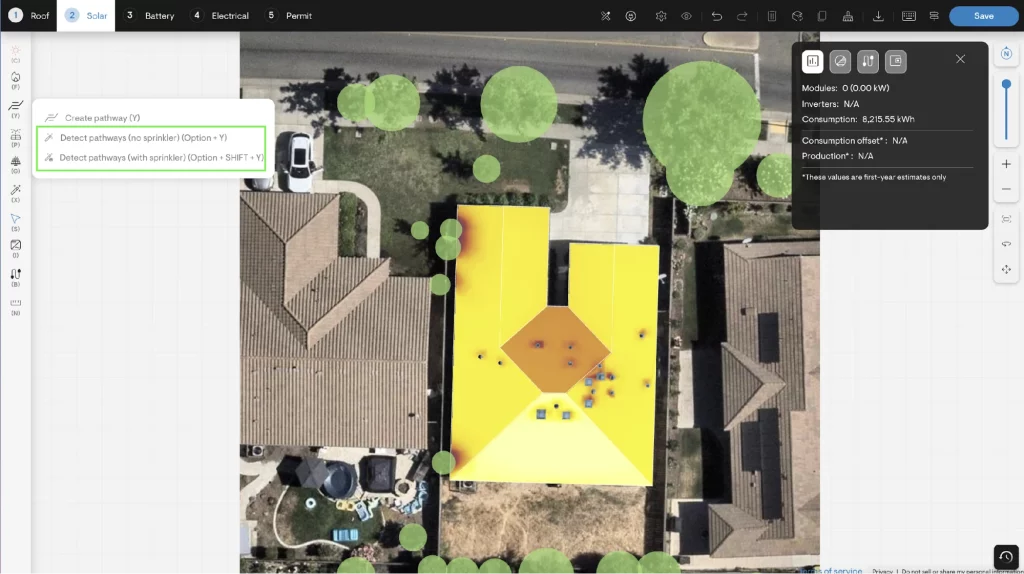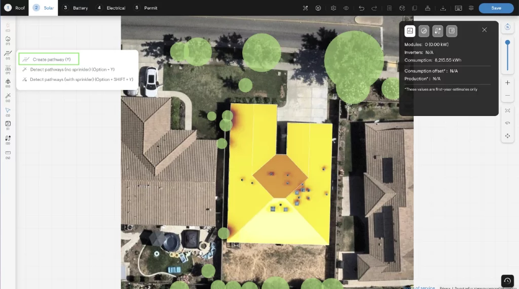 For complex roofs or nuanced AHJ rules, Solargraf provides full manual control with the “Create Pathway” tool: