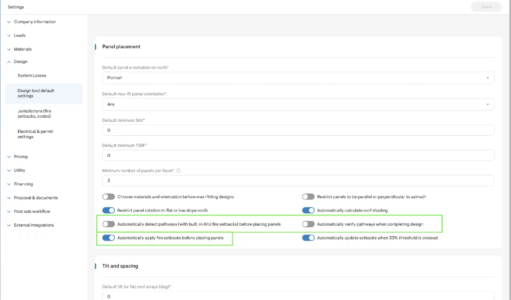 - Automatically detect pathways (with built-in AHJ fire setbacks) before placing panels: Disabled by default. Enabling this automatically places minimum required fire pathways upon entering the solar design page.